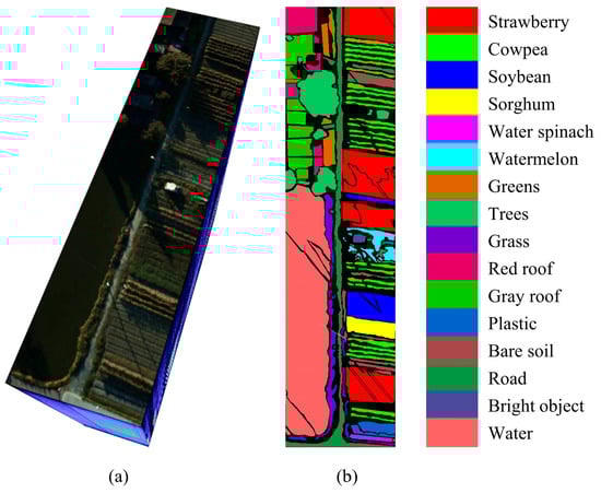 The Wuhan University dataset was obtained using the unmanned aerial vehicle (UAV)-borne visible/near-infrared Headwall Nano-Hyperspec hyperspectral systems in Hanchuan City, Hubei Province, China on 17 June 2016. The dataset features images measuring 1217 × 303 pixels, encompassing 274 spectral bands within a 400 to 1000 nm wavelength range. With a 0.109 m spatial resolution, the data size amounts to 262 MB. The dataset primarily encompasses 16 land cover classes, predominantly varied croplands. Table 2 details these classes along with their associated training and test samples. Figure 2 displays a true color composite 3D hyperspectral image cube and its associated ground reference map.