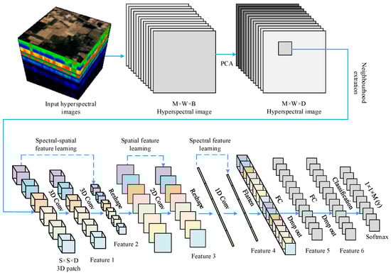 Integrated CNNs are recognized as an effective approach, utilizing a combination of two CNNs, specifically from 1D, 2D, and 3D CNNs, for accurate land cover classification results from hyperspectral images [,]. For instance, Roy et al. [] introduced an integrated CNN method called HybridSN that used 3D CNNs to derive spatial–spectral joint features from three dimensions using hyperspectral 3D cubes, while also employing 2D CNNs to process spatial details from spectral images. HybridSN offers enhanced computational efficiency and improved classification accuracy compared to 3D CNN []. However, HybridSN lacks the capacity to fully extract spectral features from the hyperspectral data and performs poorly in classifying certain land cover types [,]. Zhang et al. [] also introduced an integrated CNN model, called 3D-1D CNN, which used a 3D CNN to derive high-level spectral–spatial semantic information, followed by a 1D CNN to learn abstract spectral details. This approach has been shown to improve CNN’s computational performance in the classification of certain land cover types from hyperspectral images []. However, the 3D-1D CNN method fails to effectively account for spatial characteristics and is not suitable for multiclass classification tasks.