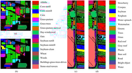 Classification results using the IntegratedCNNs method for Indian Pines and Wuhan University datasets: (a,b) ground reference map and classification results for the Indian Pines dataset; (c,d) ground reference map and classification results for the Wuhan University dataset.