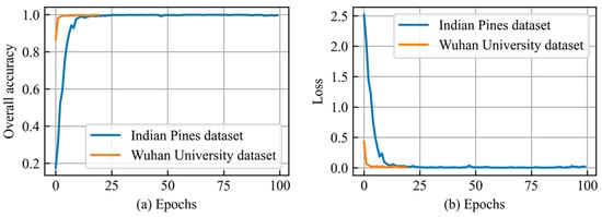 The convergence rate of the overall accuracy and loss versus 100 epochs over the Indian Pines and Wuhan University datasets: (a) overall accuracy; (b) loss.