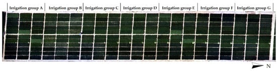 Experimental site field map. All cultivars were randomly distributed in each irrigation group.