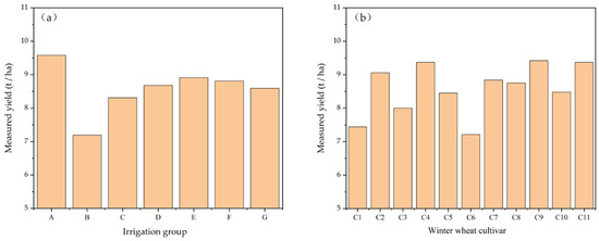Mean measured winter wheat yield value under different irrigation groups (a) and different cultivars (b).