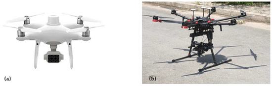 UAVs employed in the study. Multispectral images were captured by the DJI P4 Multispectral (a). Hyperspectral images were captured by the DJI M600 Pro (through the use of a Pika L hyperspectral camera) (b).