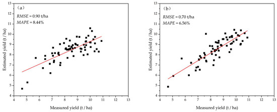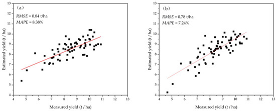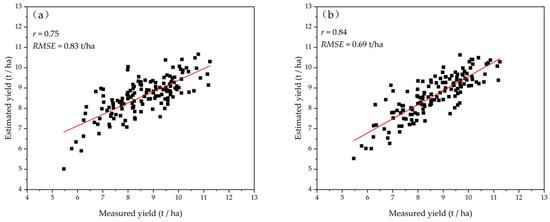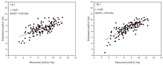 Validation of the simple linear regression model used to estimate winter wheat yield at the flowering stage based on ‘NDRE’ (a) and ‘’ (b) (n = 70). The red line is the fitted line between measured yield and estimated yield.