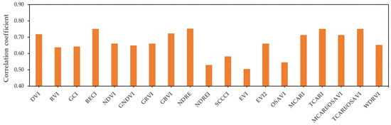 A large number vegetation indices have been proposed for grain yield estimation. A total of 19 MS VIs that were previously used for crop yield and yield-related phenotypic characteristic estimation were calculated, with average reflectance being derived from UAV MS images [3,18], and the 19 indices are shown in Table 5.