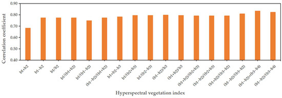 Additionally, for various spectral bands of the UAV HS sensor, the HS VIs minimized the spectral redundance, which was usually found in the hyperspectral data and also promoted the computational optimization [29,30]. Therefore, 17 prevalent formulas, composed of two, three, or four spectral bands using function of sum, difference, ratio, double difference, normalized difference, and hybrid, were regarded as the HS VIs and employed in the study [31]; the 17 formulas are shown in Table 6. Band iteration was applied to all hyperspectral bands in each formulation.