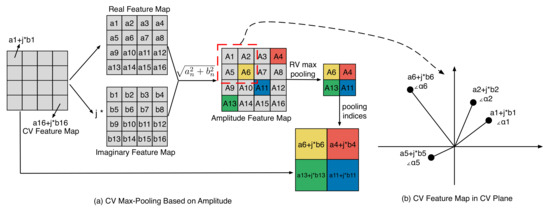 Based on Figure 2a, the complex-valued feature map can be split into real and imaginary feature maps. These two maps can then be combined into an amplitude feature map. The amplitude feature map is then subjected to real-valued max pooling, and the maximum value index is recorded. Afterward, the final pooling result is obtained by utilizing the maximum index and the original feature map. The mathematical expression for amplitude-based max pooling (CVA_Max_Pooling) is shown in Equation (8):
