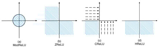 Based on (9)–(11), it is evident that these three nonlinear activations with complex values imitate ReLU in varying ways. This paper suggests an improved complex-valued nonlinear activation called HReLU, which introduces a new approach and is expressed in Equation (12).
