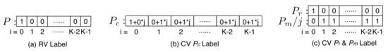 In Figure 4a, the real-valued one-hot label can be seen as a probability distribution for an object belonging to a certain category with a 100% probability (the value at the activation point is 1, and the values at the other inactivation points are 0). Figure 4b proposes a K-dimensional complex-valued vector as the CV_one-hot label, with values at activation points and the values at the inactivation point. Figure 4c shows that when the complex-valued probability is decomposed into and probability, the meaning of the CV_one-hot label becomes easier to understand. At the activation point, equals 1, and equals 0, while at the inactivation point, equals 0, and equals 1. The vector represents the probability of classification and has the same meaning as the vector P, which is used to obtain the unique class of an object via softmax. If a complex-valued probability is treated as a stochastic system, the knowledge degree of any point in the CV_one-hot label equals 1, and the chaos factor equals 0. Therefore, the CV_one-hot label has the highest stability, as well as the largest knowledge degree and the smallest absolute value of the chaos factor.