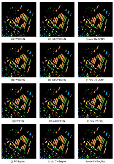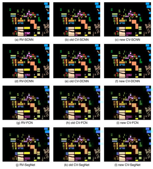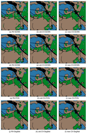Table 6 shows that all models can accurately classify woodland and open areas with classification accuracies above 96%. However, Figure 8a–f shows that CNNs sometimes confuse built-up areas with woodland. Nonetheless, according to Table 6, the classification accuracy of the new CV-SCNN for built-up areas is higher than that of RV-SCNN and old CV-SCNN by 12.6% and 5.14%, respectively. Additionally, the new CV-DCNN has a classification accuracy for built-up areas that is 10.45% and 7% higher than that of RV-DCNN and old CV-DCNN, respectively. These results suggest that the new complex-valued approach significantly improves the classification accuracy of the more challenging categories.