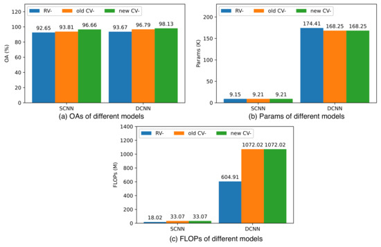 Figure 9b,c illustrates that the FLOPs of CV-CNN are significantly larger than those of RV-CNN when they share the same number of convolutional layers and the difference in the number of parameters is not substantial. This discrepancy arises because complex-valued operations can only be approximated by multiple real-valued operations in the PyTorch environment, as depicted in Formulas (1) and (2). For instance, a complex-valued addition operation necessitates two real-valued addition operations, while a complex multiplication operation requires four real-valued multiplication operations and two real-valued addition operations. It is expected that with advancements in complex-valued deep learning techniques, particularly in polarized coordinates, where a real-valued multiplication operation and a real-valued addition operation can replace a complex-valued multiplication operation, this limitation will be mitigated.