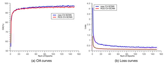 (a,b) each represent the variation curves of overall accuracy and loss function during the training process for RCE-CV-SCNN and new CV-SCNN.