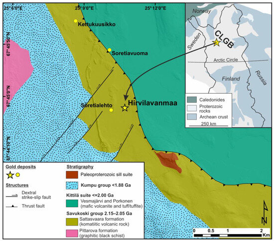 - Hulkki, H.; Keinänen, V. The Alteration and Fluid Inclusion Characteristics of the Hirvilavanmaa Gold Deposit, Central Lapland Greenstone Belt, Finland. Geol. Surv. Finland, Spec. Pap. 2007, 44, 137–153. [Google Scholar]