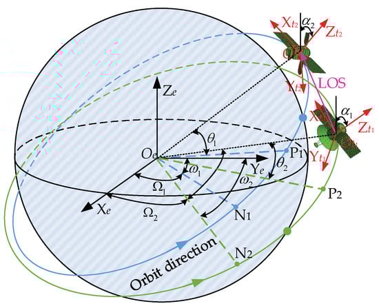 The orbit of the space target is determined by six orbital elements, which are derived from a priori two-line elements (TLEs). To be specific, these elements are expressed as (semi-major axis), (inclination), (right ascension of the ascending node), (eccentricity), (argument of perigee), and (true anomaly). Thereafter, the observation geometry transformation between the ECEF coordinate system and the RTN coordinate system can be derived according to the given six orbital elements.