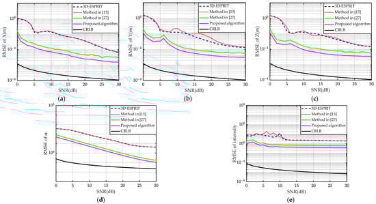According to (A5) and (A6), it can be observed that it is complicated to obtain the Cramer–Rao lower bound of the DE model. However, for most wide-band radars, we have , which is equivalent to . Therefore, by simplifying the CRLB matrix in (A5), the CRLB of the DE model can be obtained as