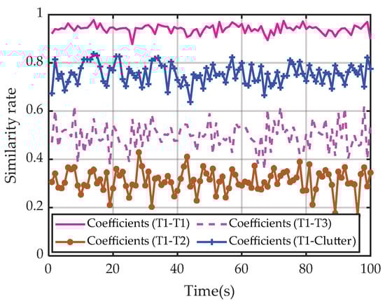To analyze the computational complexity of different filters, the computational time is compared with an Intel(R) Core(TM) i7-8700 CPU @ 3.20GHz PC with 16 GB RAM and MATLAB R2021b. The core number we have utilized is 6, and the operating system is Windows 10. And the average computational time of the four filters is given in Table 4 after 100 Monte Carlo trials. It can be observed the proposed filter has a little heavier computational burden than the Am-GM-PHD filter under two clutter scenarios, which are 3.005 s and 3.086 s corresponding to two different clutter rates. The Do-GM-PHD filter and the standard GM-PHD filter have similar computational costs. In fact, due to computing the prior knowledge of the time-varying HRRP pseudo-likelihood, the proposed filter has a similar computational cost to the Am-GM-PHD filter theoretically, and the results in Table 4 validate it quantitatively.