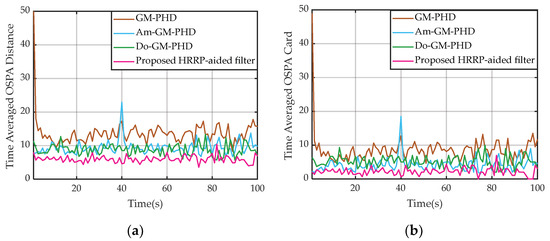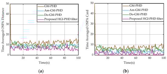 Average of OSPA errors over 100 Monte Carlo trials. (a) Mean OSPA distance. (b) Mean OSPA cardinality.