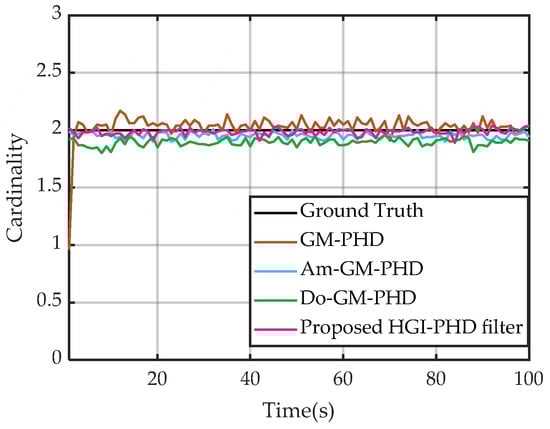 An appealing and effective way to solve the aforementioned problems is using the random finite set (RFS) theory and finite set statistics (FISST). It is known that FISST is an elegant Bayesian formulation for the description of MTT based on the RFS theory [,]. Efficient solutions such as the probability hypothesis density (PHD) [,] and cardinalized PHD (CPHD) [,,] have emerged in the MTT region in recent years. The core goal for the aforementioned filters is to update the first-order multi-target moments of the posterior probability density and update the global posterior probability density rather than recurrence, which is able to reduce the computational complexity to a large degree. Moreover, with the aim of alleviating poor cardinality estimation performance accuracy of the standard PHD filter, the CPHD filter is proposed to ease the above tension. It should be noted that the sequential Monte Carlo (SMC) model [] and the Gaussian mixtures (GM) model [] are the two most typical implementations of the above-mentioned Bayesian-based filters.