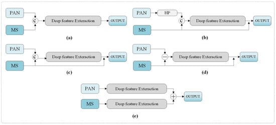 With the development of artificial intelligence, machine leaning methods [,,] and deep learning methods have been dominant in remote sensing processing and interpretation [,,,]. Notably, convolutional neural networks (CNNs) have exhibited promising performance [,,,] owing to their adeptness in uncovering abstract features within remote sensing imagery. Their robust prowess in image reconstruction further contributes to their efficacy in this context. CNN-based pansharpening can be conceptualized as an image fusion and reconstruction network, trained in an end-to-end manner. The existing approaches can be categorized into five distinct frameworks, as illustrated in Figure 1.