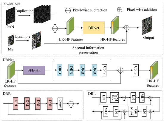 Deep feature extraction. A more complex network is used to extract spatial information. As shown in Figure 2, the input of DRNet is low-resolution high-frequency (LR-HF) features. The image is blurry at this point because it just subtracts from PAN and upsamples MS, without spatial feature extraction. After the DRNet extracts the spatial features of LR-HF features, the high-resolution high-frequency (HR-HF) features will be output. The image resolution is higher at this point.