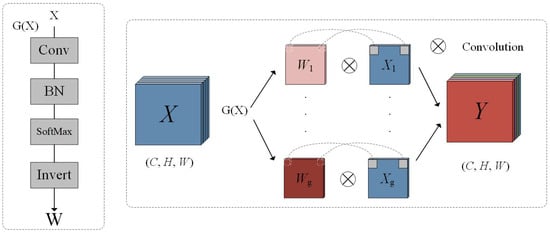As different channels will contribute different spatial information, the feature map is parted into several groups to better obtain the spatial information. This operation is also used in channel attention. The feature map is not divided into one channel for each group. Instead, the feature map is divided into several channels for each group in order to accelerate the training speed. Firstly, feature maps are divided into g groups in the channel dimension, and each group can be presented as , where . For each group, one convolution kernel map is generated as