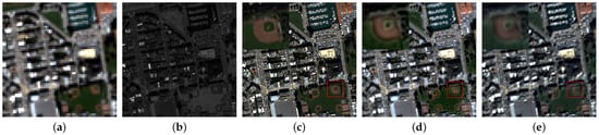 For reduced-resolution tests, four commonly used indices were employed, including spectra mapper angle (SAM) [], Erreur Relative Globale Adimensionnelle de Synthèse (ERGAS), spatial correlation coefficient (SCC) [] and the multiband extension of the Universal Image Quality Index, denoted by [], where Q4 represents four-band images and Q8 represents eight-band images. Specifically, SAM evaluates spectral distortions in resulting images compared with the ground truth. ERGAS represents the relative global dimensional synthesis error, while SCC evaluates the similarity of the spatial details between the results and the ground truth. Furthermore, is a composite measure comprising various factors to encompass correlations, the mean of each spectral band, intraband local variance and the spectral angle. Consequently, it incorporates both intraband and interband distortions within a unified index.