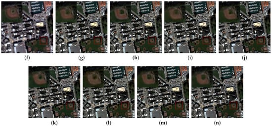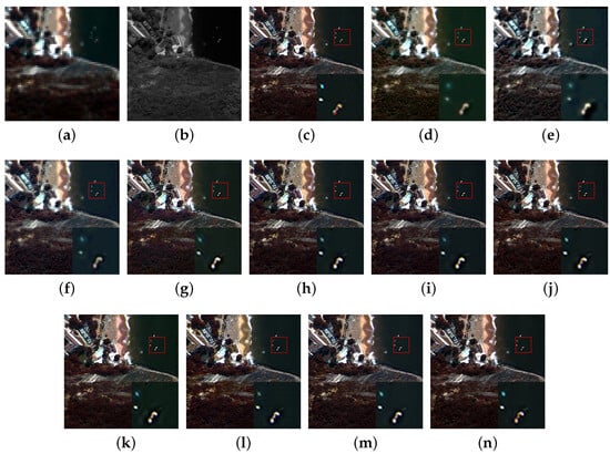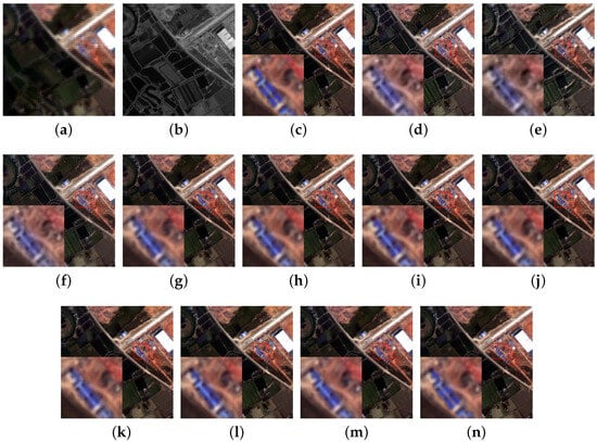 Reduced-resolution results on the WorldView3 imagery: (a) MS image. (b) PAN image. (c) Ground truth. (d–n) Pansharpening results obtained using (d) GSA, (e) MTF-GLP-HPM, (f) SFIM, (g) DiCNN, (h) MSDCNN, (i) DRPNN, (j) FusionNet, (k) PNN, (l) PanNet, (m) HyperTransformer and (n) the proposed approach.