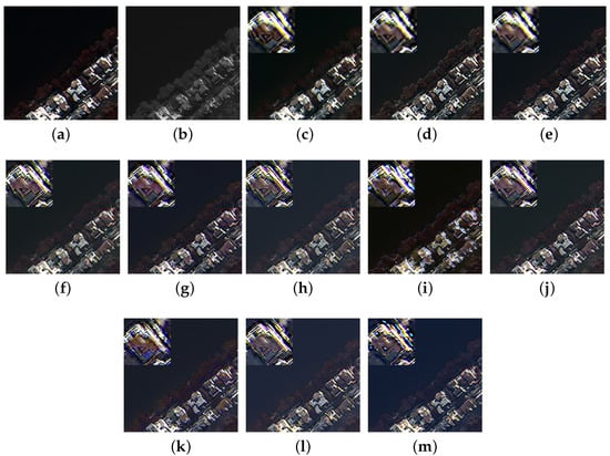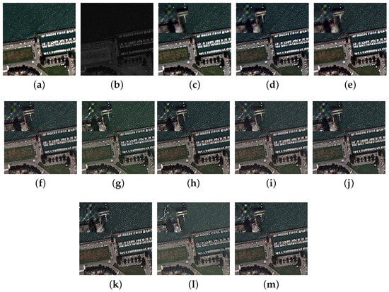 Full-resolution results on the WorldView3 imagery: (a) MS image. (b) PAN image. (c–m) Pansharpening results obtained using (c) GSA, (d) MTF-GLP-HPM, (e) SFIM, (f) DiCNN, (g) MSDCNN, (h) DRPNN, (i) FusionNet, (j) PNN, (k) PanNet, (l) HyperTransformer and (m) the proposed approach.
