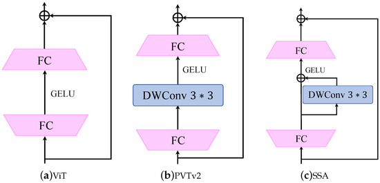 We show three common feed-forward neural networks in Figure 5. The multi-head self-attention module extracts information in the spatial dimension, while the FFN extracts information between channels through a fully connected layer. Specifically, the standard FFN interacts within the channel dimension and does not operate in the spatial dimension. PVTv2 [51] and SSA [53] add a deep convolution between two fully connected layers to refine spatial features. But this does not completely solve the problem of large parameter counts. The lightweight FFN(L-FFN) proposed in this work remedies this problem. We used deep convolution with a kernel size of to extract information in the spatial dimensions and then used point convolution to enable the interaction of information between channels. This structure not only reduces the number of network parameters but also compensates for the disadvantage of the traditional FFN, which is insensitive to spatial dimensions. The specific computational process of the lightweight feed-forward neural network can be expressed as follows: