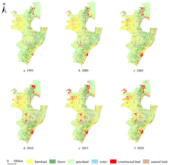 Spatiotemporal pattern of land use from 1995 to 2020 (derived from object-oriented classification).