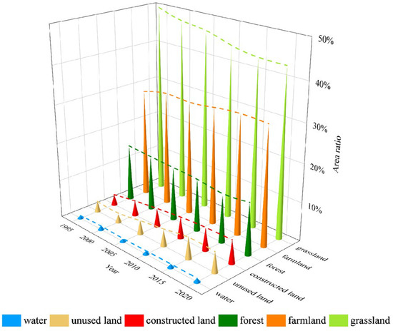 Temporal changes in the area occupied by each land use type in the study area from 1995 to 2020.