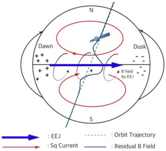 Both the EEJ and the EIA are thought to be caused by the electric field developed by charge separation between the dawn and dusk sides of the ionosphere as a result of collisions between plasma and neutral wind, although the altitudes of the two phenomena are different. Figure 1 demonstrates the EEJ flowing eastward along the equatorial E-region of the ionosphere (blue arrow). This occurs due to the large electric field that develops between the dawn and dusk sides owing to the conducting nature of the ionospheric plasma. The current is principally the Pederson current, and the Hall current is known to strengthen the eastward current [6]. Sq (Solar quiet) currents also exist in the midlatitude region, as shown in Figure 1. However, the magnetic field generated by Sq currents is weaker than that of the EEJ and has been described in a larger region in general [6].