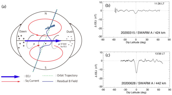 The resultant EEJ component values are shown in Figure 3b,c. The same schematic illustration in Figure 1 is repeated in Figure 3a for convenience. It demonstrates that because the EEJ current flows eastward along the geomagnetic equator, the magnetic field formed by the current is southward, opposite to the geomagnetic field, at the satellite orbit altitude. The residual magnetic field varies according to the latitude, and hence, the polar orbit is suitable for observing the EEJ. Figure 2b,c shows the derived residual magnetic fields in orbit on 15th March and 28th June 2020, respectively, indicating the clear signature of the EEJ. These two events correspond to a case of a small amplitude residual field (a few nT) and another case of a far larger amplitude residual field (>10 nT), respectively.
