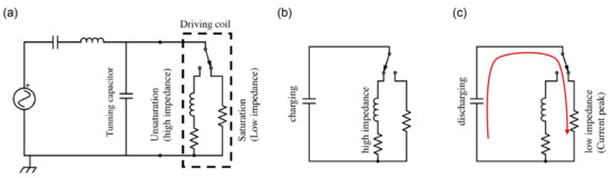 (a) Equivalent circuit of the driving part. (b,c) show the circuit behavior for the cases of high impedance (unsaturated) and low impedance (saturated), respectively. The red arrow in (c) represents the discharging current from the tuning capacitor which helps the peak shaping as well as saves the power consumption.