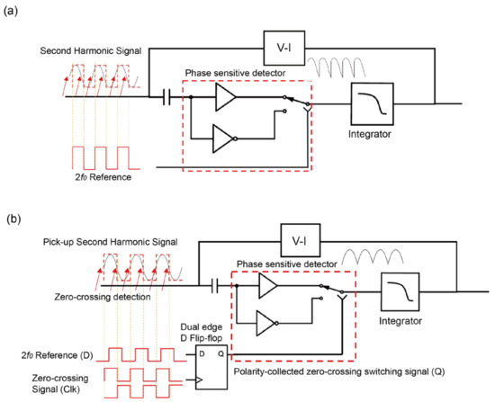Figure 7 shows the traditional pick-up circuit triggered by the 2f0 reference signal and the newly devised adaptive in-phase concept utilizing zero-crossing detection and switching by a dual-edge D flip-flop. In the case of the traditional pick-up circuit shown in Figure 7a, the output from the pick-up coil can have a phase delay, and hence, the switched signal triggered by the 2f0 reference can be distorted when the phase delay is relatively large. In the case of a 90◦ phase delay, the switched signal loses most of the polarity information of the pick-up signal. In contrast, if the pick-up signal is switched by the zero-crossing reference signal and the polarity is determined by the 2f0 reference signal, as depicted in Figure 7b, then the feedback control can be functional even when the phase delay approaches 90°. Thus, the adaptive in-phase concept is expected to be tolerant to phase changes caused by thermal distortion and to have a wider frequency range (f0). The trade-off study to optimize and stabilize the fluxgate in terms of driving frequency (f0) and pick-up frequency (2f0) will be described in Section 4.3 below.