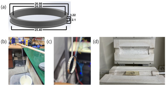 (a) Dimensions of the AIMAG ring core in units of mm. (b) 2714A coated with Mg(OH)2. (c) 2714A spot-welded AIMAG ring core. (d) Heat treatment of the AIMAG ring core.