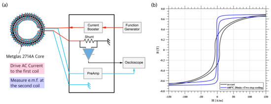 (a) Schematic of the setup to measure the B–H curve on the 2714A core. (b) Comparison of B–H curves of the 2714A between as-cast (black) and after heat treatment (blue).