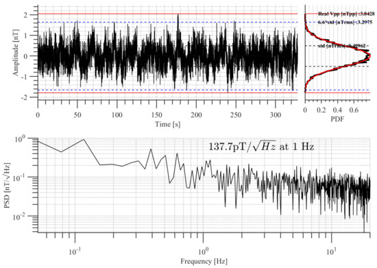 The noise magnitude of the AIMAG is one of the most important factors to secure the measurement accuracy required for detecting EEJ signatures. The noise characteristics of the AIMAG were measured in a three-layer µ-metal magnetic shielding can (TLMS-C100), which reduces the ambient magnetic disturbance by a factor of 1/1000. The dynamic range was adjusted to ±50,000 nT during the test, and data were obtained for 300 s with a sampling rate of 40 sps (samples per second). Figure 10 shows the measured noise amplitude and its power spectrum. In this experiment, we achieved noise levels of PSD = ~150 and an amplitude = ~500 pT (RMS). These values satisfy the technical requirements of 300 pT/Hz and 1 nT (RMS) or less shown in Table 1 above.
