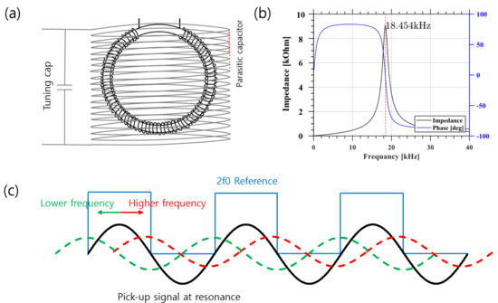 (a) Fluxgate sensor schematic. (b) Impedance plot of a pickup coil. (c) Relative phase change of the 2f0 and pick-up signals according to frequency.