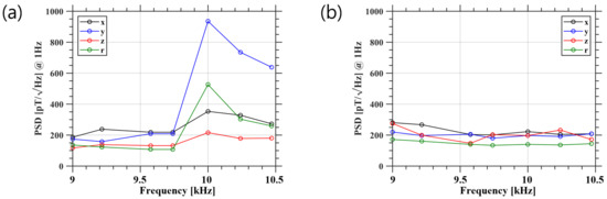 The relative phase of the signal can affect the noise magnitude. To evaluate such an effect, the output noise powers were compared between a typical fluxgate circuit without an adaptive in-phase function and a circuit with an adaptive in-phase function. This task was motivated by a report on the temperature effect [15], in which the fluxgate second harmonic signal suffered from a phase shift of approximately 0.7°/°C below 20 °C, which can increase the noise levels. By comparing two cases of fluxgate circuits, we demonstrate the importance of phase correction. This comparison was performed by varying the driving frequency, which ultimately corresponds to changing the pick-up signal phase. Note that a deviation in the second harmonic frequency of 1 kHz, for example, corresponds to a phase change of >60 degrees in Figure 11b. The driving circuit uses a tuned capacitor such that the current can be supplied most effectively at 9.2 kHz. When the driving frequency is changed, the phase of the driving current changes with respect to the 2f0 reference signal, and the phase of the pick-up signal changes accordingly. Figure 12a shows the noise power spectrum obtained with the typical circuit. Measurements were taken in each of the x, y, z and r axes. The results for all axes show that the noise is flat until 9700 Hz, after which it increases sharply. This result occurs because the signal’s response magnitude decreases outside of the pick-up’s resonance frequency and the signal’s phase becomes out of phase with the 2f0 reference signal. Figure 12b shows the noise power spectrum for the adaptive in-phase circuit. The noise PSD levels in all axes lie between 100 and 300 around our target frequency of 9.2 kHz. A comparison of Figure 12a,b shows that the adaptive in-phase circuit effectively provides adaptive phase correction. Furthermore, we consider that our adaptive in-phase circuit is more effective than a phase correction process based on a look-up table constructed by real-time temperature monitoring [15]. However, the noise of the adaptive in-phase circuit is 10–50 pT higher in the relatively in-phase state, which is a problem caused by the inability to effectively remove the digital noise generated by the dual-edge D-flip-flop. This aspect should be improved in the future.