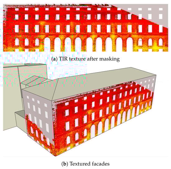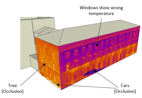 Previously, researchers have attempted to extract thermal textures for 3D building models. Ref. [6] presents a mobile thermal mapping technique that extracts thermal textures using thermal image sequences, 3D building models, and point clouds. They introduced two workflows. The first workflow determines image orientations by co-registering terrestrial image sequences with a 3D building model. In the second workflow, given pre-orientations of TIR and RGB image-based point clouds are used to match them, and then the ICP algorithm is performed to minimize the distance between the point clouds. Finally, thermal textures are extracted by correcting the orientation parameters of TIR images. Refs. [21,22,23,24] refer to the concept of projecting the image sequence to the facade plane in a bundle adjustment process of tracked feature points to generate the facade’s thermal textures. Figure 1 shows the facades textured from TIR image sequences based on these approaches. One drawback is that, compared with images in the visual domain, 3D reconstruction of TIR images has less accuracy due to the lower resolution of TIR images. It gives rise to more discretization and decreases matches between the image sequence. Another drawback is that objects in the TIR domain show radiometric behavior, which causes blurred edges and fewer changes in intensity and details in an image. Other drawbacks of the textures extracted using the above-discussed methods are that occlusions are not considered, and they also include window glasses, which often show the wrong temperature due to reflections, as illustrated in Figure 1.