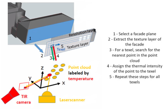 Thermal inspection of buildings regarding efficient energy use is an increasing need in today’s energy-demanding world. This paper proposes a framework for mapping temperature attributes from thermal point clouds onto building facades. The goal is to generate thermal textures for three-dimensional (3D) analysis. Classical texture generation methods project facade images directly onto a 3D building model. Due to the limited level of detail of these models, projection errors occur. Therefore, we use point clouds from mobile laser scanning extended by intensities extracted from thermal infrared (TIR) image sequences. We are not using 3D reconstructed point clouds because of the limited geometric density and accuracy of TIR images, which can lead to poor 3D reconstruction. We project these thermal point clouds onto facades using a mapping algorithm. The algorithm uses a nearest neighbor search to find an optimal nearest point with three different approaches: “Minimize angle to normal”, “Minimize perpendicular distance to normal”, and “Minimize only distance”. Instead of interpolation, nearest neighbor is used because it retains the original temperature values. The thermal intensities of the optimal nearest points are weighted by resolution layers and mapped to the facade. The approach “Minimize perpendicular distance to normal” yields the finest texture resolution at a reasonable processing time. The accuracy of the generated texture is evaluated based on estimating the shift of the window corner points from a ground truth texture. A performance metric root-mean-square deviation (RMSD) value that measures this shift is calculated. In terms of accuracy, the nearest neighbor method outperformed bilinear interpolation and an existing TIR image-based texturing method.