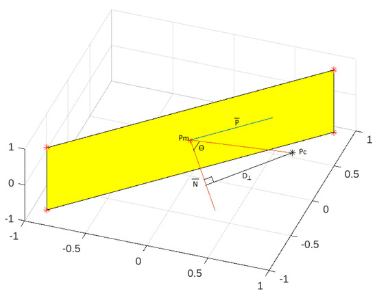 where is the perpendicular distance from the external candidate point () to the normal vector. It is also shown in Figure 4. For each of the filtered neighbor points, the algorithm checks for the minimum perpendicular distance points and then selects the closest distance point (from texel mid-point) out of them to map the thermal intensity.