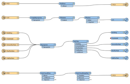 The LoD2 City Geography Markup Language (CityGML) models are georeferenced and reprojected to a standard coordinate system EPSG:25832—ETRS89/Universal Transverse Mercator (UTM) zone 32N. All the input data are transformed into this coordinate system using Feature Manipulation Engine (FME). The point clouds in the local Euclidean coordinate system are georeferenced by performing an affine transformation that includes translations and rotations. The affine transformation is carried out either in FME or MATLAB. If the exact world coordinates are known, then the georeferencing can also be carried out by manually offsetting in the X, Y, and Z directions and 3D rotation. This manual adjustment can always be carried out in FME if there is a mismatch between the transformed and ground truth coordinates.