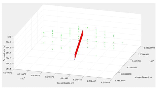 The next step is to define the neighborhood for each texel, i.e., to find neighbor points in the thermal point cloud within a predefined radius from the mid-point of the texel. The radius is set to 1 m. Later, in Section 5.3, it will be discussed how the performance is affected when we change the radius from 0.3 m to 1 m. Figure 10 shows the neighbor points (green) for a single texel plane (red).