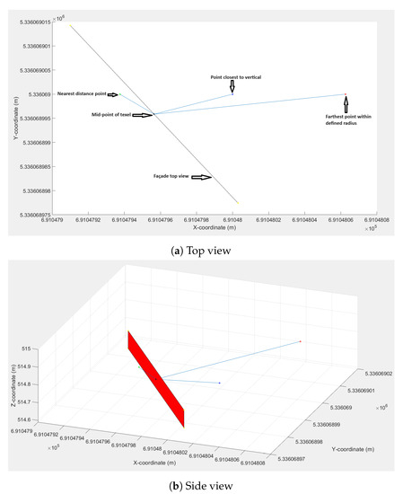 Then, the algorithm searches for the nearest point vertical to the texel and which has a temperature attribute. Three methods are approached: angle to normal vector, perpendicular distance to normal vector, and distance without considering their verticality. We already discussed these three approaches in detail in the previous section. Their performance results will be discussed and compared later in Section 5.2. Figure 11 shows the detected optimal point closest to the vertical (blue) for a single texel plane (red), the nearest distance point (green), the farthest point within a predefined radius (red), and lines connecting the texel mid-point (black) to the detected points for illustration. The figure shows both the top view and side view. From the figure, it can be clearly seen that the nearest distance point is not normal to the texel mid-point, and the point closest to vertical is a bit far from the nearest distance point.