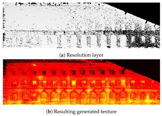 After selecting the nearest optimal point, a resolution layer is applied before mapping the thermal intensity values to the texture layer. The resolution layer contains the quality information of points in the thermal point cloud. The quality corresponds to the distance from the TIR camera (selected image center) to the points. The points at less distance have higher quality or resolution, and vice-versa. The points without thermal attributes are assigned zero values in the quality layer. The windows and doors of the generated texture image are then removed by applying a mask.