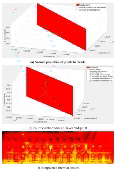 The main innovation in this paper is the usage of thermal point clouds to generate thermal textures. Previously, researchers worked on generating thermal textures directly from TIR images or point clouds reconstructed from TIR images. Some classical texture generation methods project facade images directly onto the 3D building models. Due to the limited level of detail of these simplified building models, projection errors occur. Some other drawbacks, such as limited geometric density and lower resolution/accuracy of TIR images, lead to poor 3D reconstruction or blurry textures. Also, TIR images include reflections from window glasses and occlusions. Objects in the TIR domain show radiometric behavior, which causes blurred edges in the generated textures. In Section 2, we discussed the drawbacks of facade texture generation from TIR images. Therefore, to overcome the limitations of these methods, we are using thermal point clouds prepared by extending laser scanner point clouds with intensities from TIR images. The reason why we used point clouds instead of images for texture generation is because of TIR image interpretation challenges, discussed in detail in Section 2. We projected the thermal point clouds to building facades by using a mapping algorithm. The mapping algorithm uses a nearest neighbor approach. Later, we also implemented bilinear interpolation and compared that with the nearest neighbor. We also investigated different approaches for the nearest neighbor search to calculate the intensities, compared and analyzed them, deduced the best-suited approach, and finally presented a performance metric of the results.
