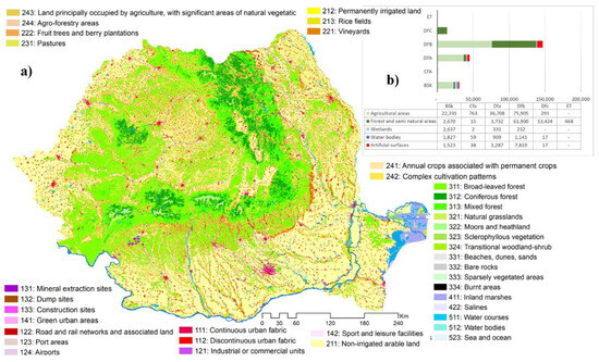 (a) Land use in Romania according to Corine Land Cover 2018 [45]. (b) The surface occupied by the main categories of land use in different climatic zones in Romania (in km2).