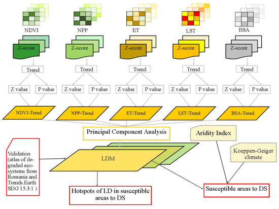 Methodological flowchart of this study. NDVI, NPP, ET, LST, and BSA are biophysical parameters; z-score represents the anomaly of each parameter; z value—trend and p value—statistical significance according to the Mann-Kendall test; NDVI-Trend, NPP-Trend, ET-Trend, LST-Trend, and BSA-Trend resulted from the combination of the z value and p value parameters; LDM—index for assessing the intensity of land degradation.